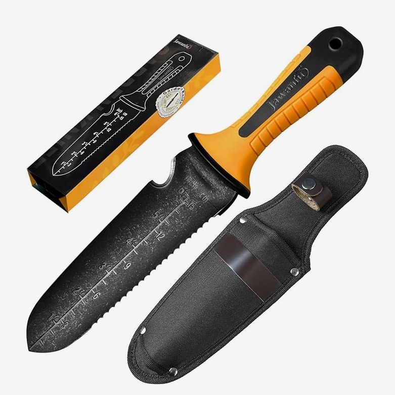 The hori-hori knife dates back centuries, to a time when agriculture was central to Japanese mountain life. Cleverly designed to harvest root vegetables and bonsai trees, it also cuts through dead stalks, roots, and mulch bags like butter. Adding the hori-hori knife to my tool bucket has replaced my constant grabbing for multiple tools. Instead of separately using my scissors, hand shovel, trowel, utility knife, and handsaw, I simply use my hori-hori knife for scooping, digging, cutting, seeding, sawing, and even measuring (the blade is marked in inches so you can easily deduce how much farther down you need to dig for planting).